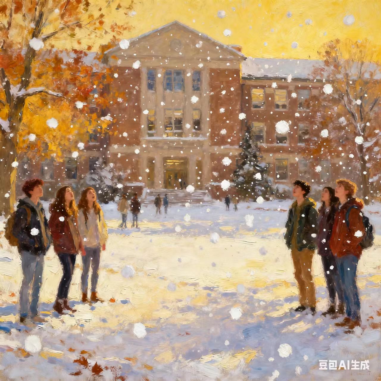 清晨走出宿舍樓,迎面而來的不是熟悉的秋涼,而是裹著雪香的微風(fēng)——昨日在枝頭綴滿的金黃楊絮、在風(fēng)里舒展的赤色楓葉,此刻都覆上了一層薄如蟬翼的初雪,像被時光揉碎了的月光,輕輕鋪在校園的每一處角落。原來,一場初雪真的叩響了秋的門扉。