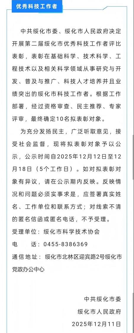 近日,中共綏化市委、綏化市人民政府開展第二屆綏化市優(yōu)秀科技工作者評比,表彰在基礎(chǔ)科學(xué)、技術(shù)科學(xué)、工程技術(shù)以及相關(guān)科學(xué)領(lǐng)域從事研究與開發(fā)、普及與推廣、科技人才培養(yǎng)并且業(yè)績突出的綏化市科技工作者。我校藝術(shù)設(shè)計學(xué)院教師高冰榮獲“綏化市優(yōu)秀科技工作者”榮譽(yù)稱號。